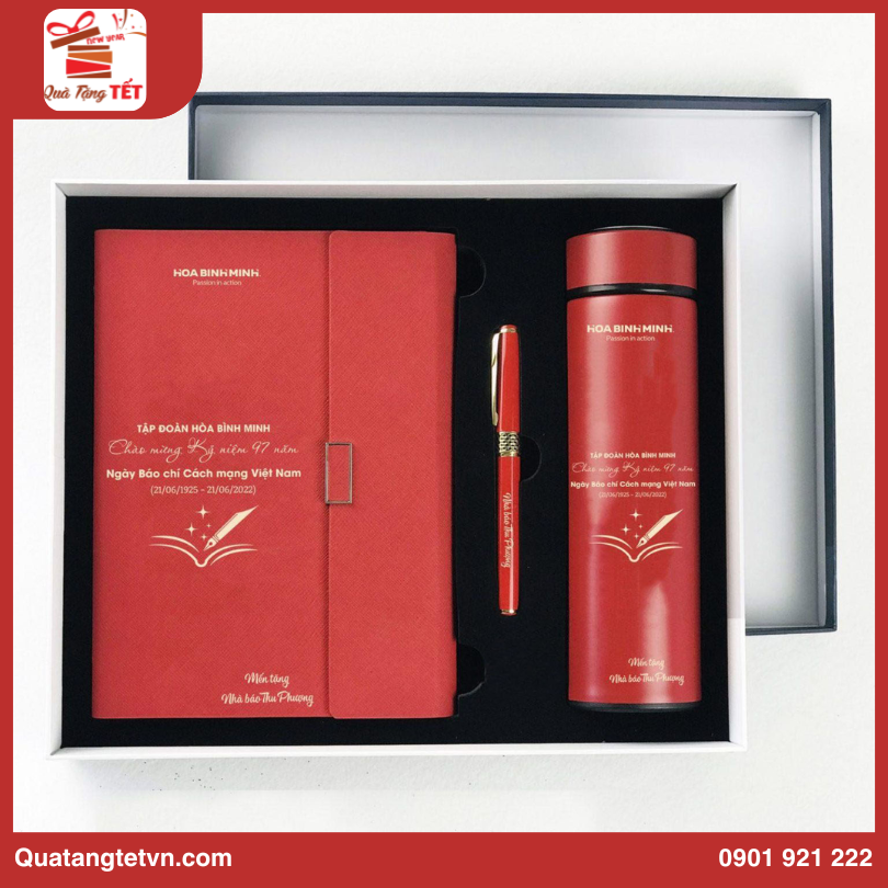 Sự kết hợp giữa sổ tay sang trọng, bút ký tinh tế và bình giữ nhiệt in logo tạo nên một bộ quà Tết vừa đẹp mắt vừa hữu dụng. Đây là mẫu gift set được nhiều doanh nghiệp lớn yêu thích vì mang thông điệp chúc sức khỏe – thành công – khởi đầu mới đầy đủ và thiện ý. Toàn bộ vật phẩm có thể cá nhân hóa theo logo, slogan, thông điệp năm mới, giúp doanh nghiệp tạo dấu ấn thương hiệu đồng nhất. Hộp định hình cao cấp mang lại cảm giác sang trọng ngay khi mở quà, rất phù hợp cho dịp Tết.
